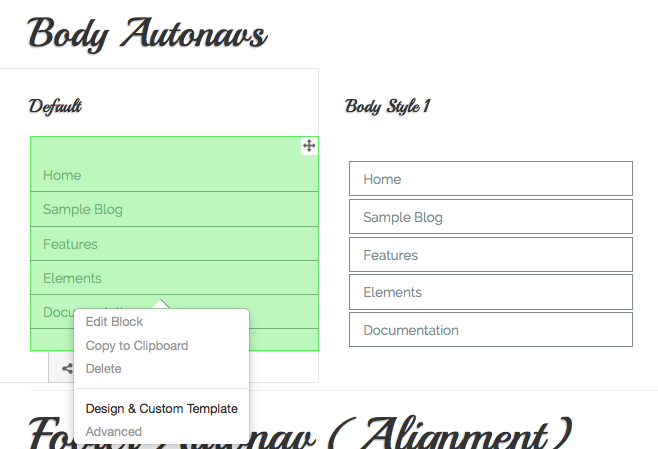 This should open up another set of icons that will help you customize the autonav block. Click on the cog icon and you should see a select box for custom templates. Here, you can choose the appropriate custom block for your autonav block. For more information about the autonav blocks click here : Autonav Custom Templates